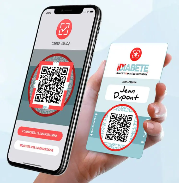 La carte iDiabète, carte connectée d’identité du diabète, accessible sur smartphone par le scan d’un QR Code, permet au patient d’avoir toujours sur lui son traitement et ses informations essentielles concernant son diabète. Par exemple, en cas de coma, les urgentistes peuvent y accéder selon une procédure sécurisée. Le patient peut aussi l’utiliser à chaque moment lorsqu’il a besoin de communiquer ces informations à un professionnel de santé.